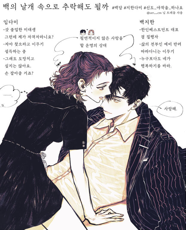 다미는 섣달그믐밤 설화를 주제로 작업하는 학부생입니다. 이야기의 가능성에 대해 고민하고, 자신이 섣달 그믐밤에 지은 이야기에 나오는 요소를 그림으로 표현하죠. 이야기꾼은 아니기에 백을 만나기 전까지는 설화계의 존재를 모릅니다. …그리고 졸업을 준비하며 생각보다 녹록하지 않은 현실에 좌절하는 중이고요. 다미는 최근에 한인베스트먼트에서 주최하는 유명 작가 전시를 관람하다 부러운 마음 반 현실 자각 반 답답한 마음에 혼자 바에 술을 마시러 갑니다. 백은 반려인 다미가 전시에 왔는지 체크하다가, 바에 가는 모습을 보고 따라가게 되죠. 혼자 온 척 다미 옆자리에 앉습니다. 그러다 의외로 다미가 백에게 먼저 말을 걸게 되는데… 백이 대화에 응합니다.